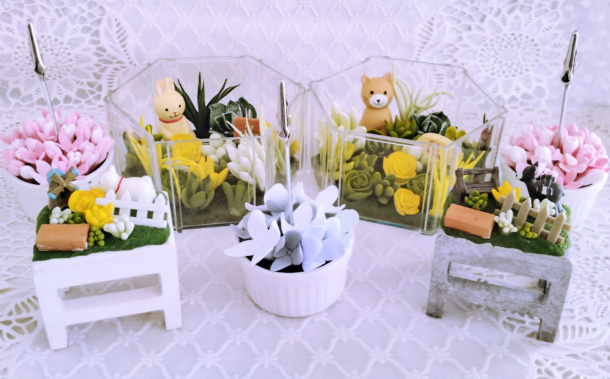 今回は新緑の季節に合わせて多肉植物のアニマルアレンジとさわやかな色合いの小花のメモスタンド🌸
