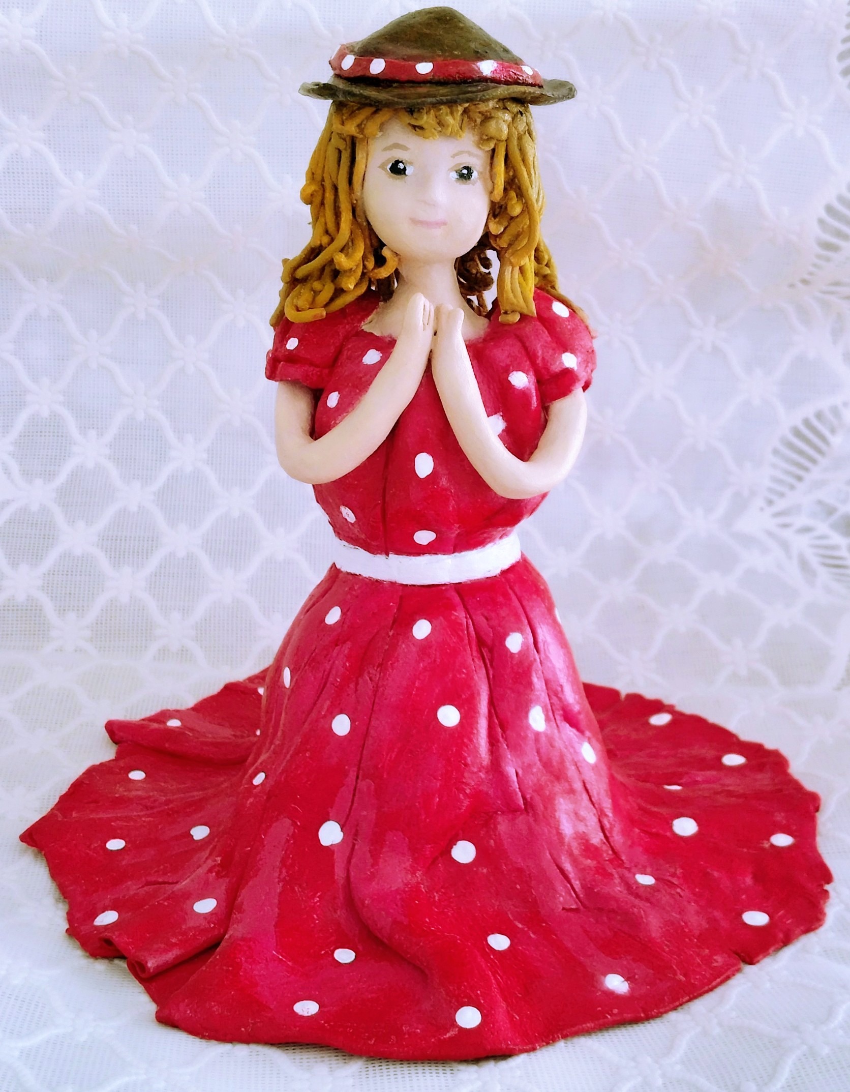 座った赤い鮮やかなドット柄のスカートが目立つ可愛い人形です。