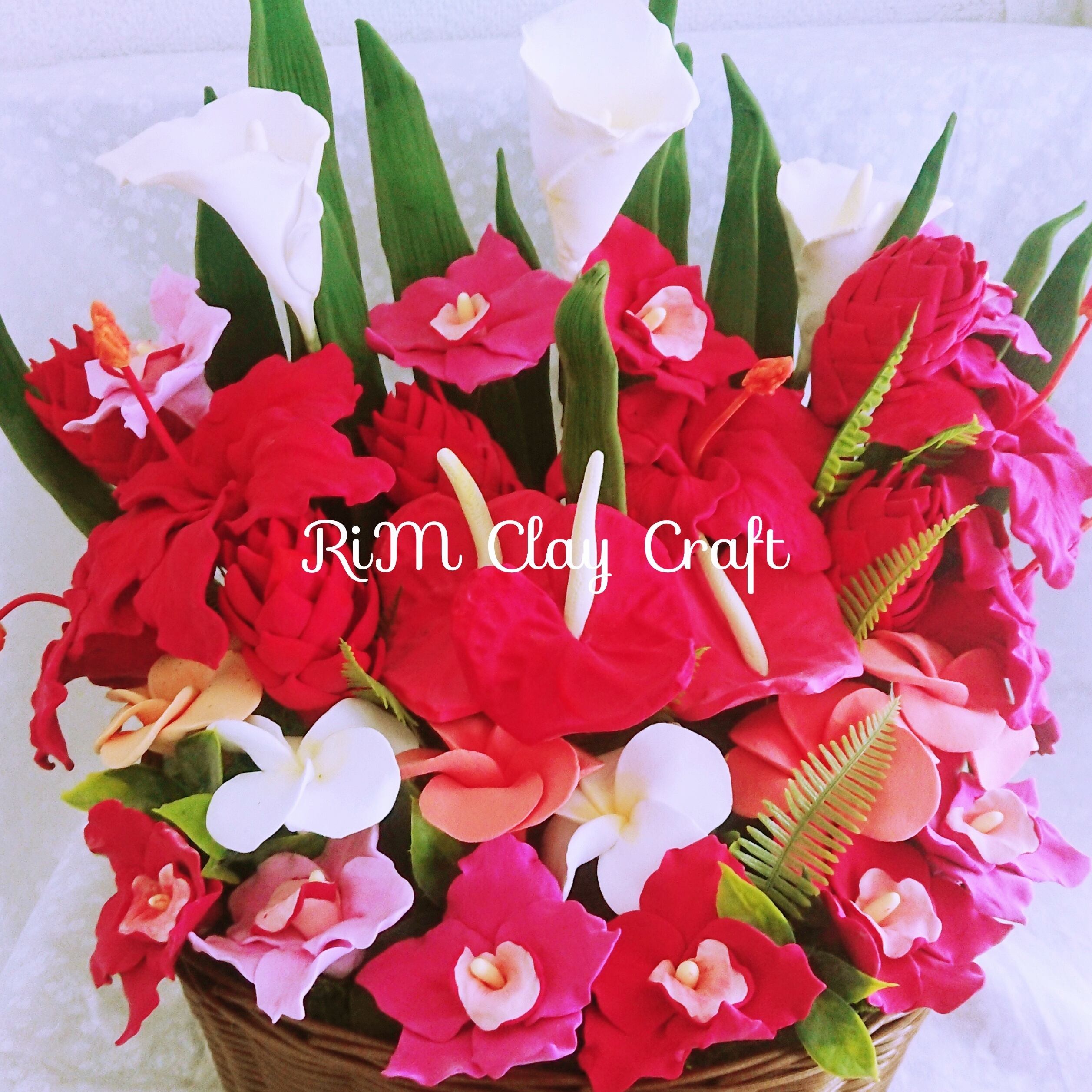樹脂粘土で作った南国の明るい赤い花のアレンジメント