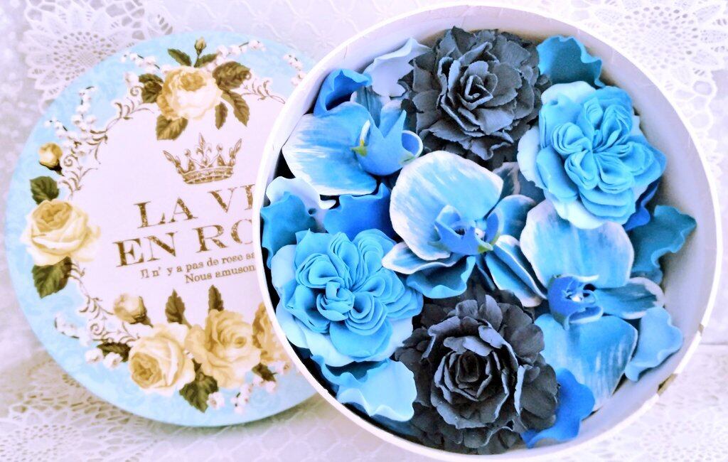希少な青い胡蝶蘭と薔薇をたくさん箱に敷き詰めました